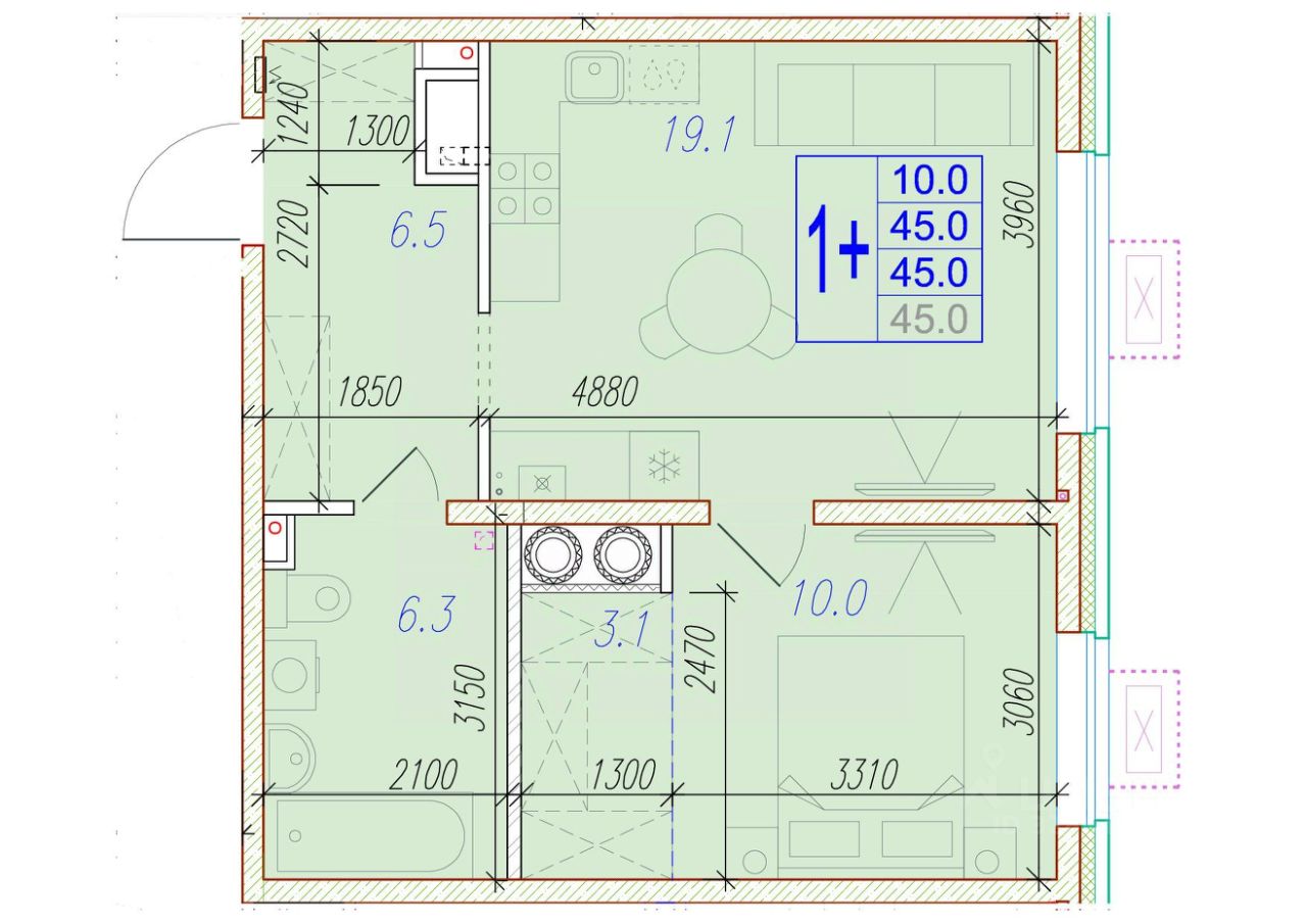 Общая площадь45 м²