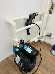 Полы сочетают плитку и специализированный линолеум для теплых полов, стены в комнатах оклеены обоями под покраску, в санузле использован керамогранит с безупречной подгонкой углов. Входная дверь металлическая сейфовая, внутренние двери оснащены магнитными замками для бесшумного закрывания. Установлен дополнительный насос с фильтром для воды, хотя напор и без того стабильный.