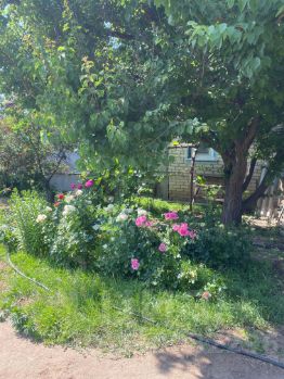 Участок ухожен, с цветущими клумбами и зелёными насаждениями. Есть место для парковки автомобиля.