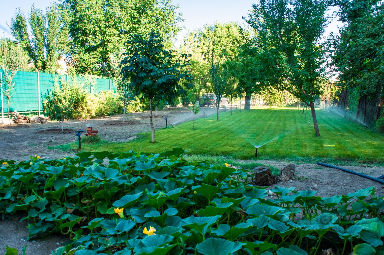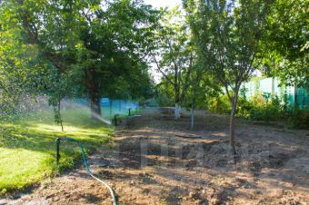 Половина участка засажена газоном, который требует минимального ухода Под газоном выполнена разводка труб и оросителей для автоматического полива Другая половина участка свободна для размещения грядок и кустов, или для продолжения газона. По всему участку стройными рядами высажено около 30 шт. молодых сортовых деревьев, которые уже дают урожай