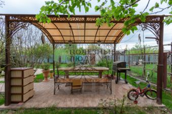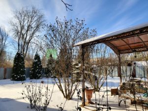 Участок: Идеально квадратной формы. Вымощенные плиткой дорожки, плодовые деревья, ягодные кустарники, декоративные ели и великолепные розы. Есть летняя беседка и зона для барбекю.
