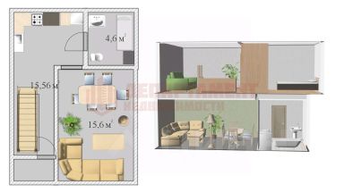 Первый этаж кухня гостиная 15 кв.м. гараж 16 кв.м. санузел 5 кв.м
