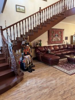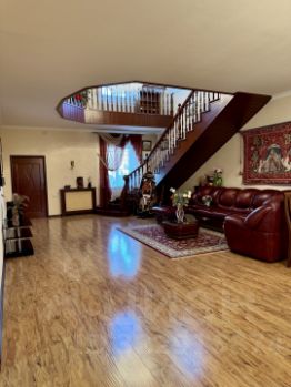 первый этаж (высота потолков 3,27)- прихожая (6 кв.м), холл (63,7 кв.м), кухня (24,4 кв.м), санузел (9,8 кв.м.), жилая комната (19,4 кв.м.);