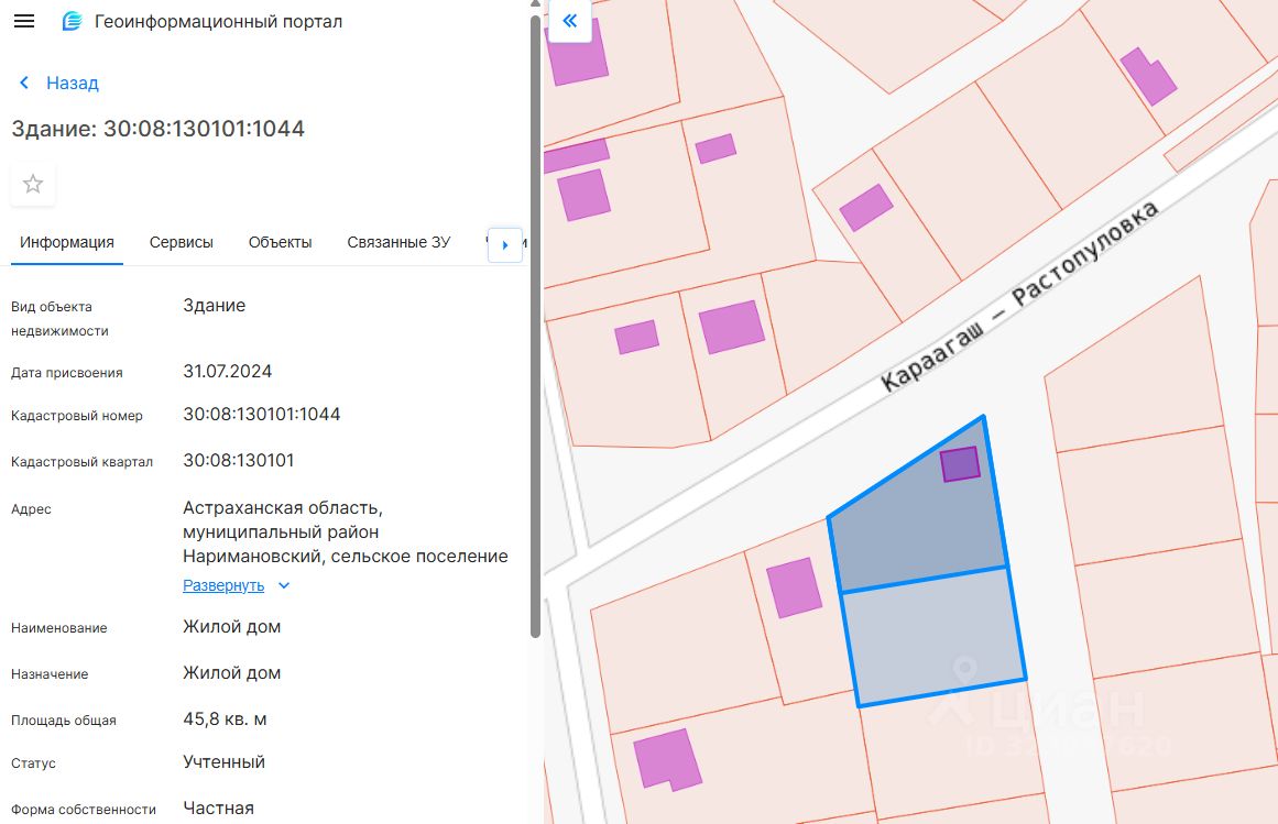 Дом в пос. Караагаш общей площадью 45,8 кв. м (дом- 25,4 кв. м с террасой-20,4 кв. м) на приусадебном участке ЛПХ 20 соток. Дом: фундамент- ленточный, монолитный железобетон; стены- пеноблок; крыша двускатная, общая с террасой, стропильная система, кровля- металлочерепица; полы -монолитная ж/б плита; терраса- монолитная ж/б плита. В дом заведена водопроводная труба диаметром 25 мм и выполнена разводка канализации и выпуск в септик диаметром 100 мм. Электричество-3ф, 15,0 кВт. Вода-скважина-16,0 м (не эксплуатировалась 4 года). Газ- по границе. Центральный водопровод от станции 1-го подъема- по границе. До центра Астрахани- 27 км. Общественный транспорт- автобус 191. До р.Волга-650 м. Продуктовый магазин, контейнеры ТБО- в шаговой доступности- до 500 м. Единственный собственник.