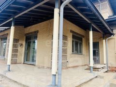 Строение возведено на сваях с применением материалов премиум-класса: несущие конструкции из самарского керамического кирпича, фасад из кирпича ручной формовки, кровля из французской керамической черепицы и дымоходы словацкого производства. Подшивка крыши и навесов выполнена из долговечного термодерева.