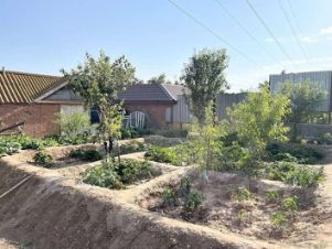 Двор ухоженный. Много плодоносящих деревьев и кустарников. Красивая многолетняя сосна.