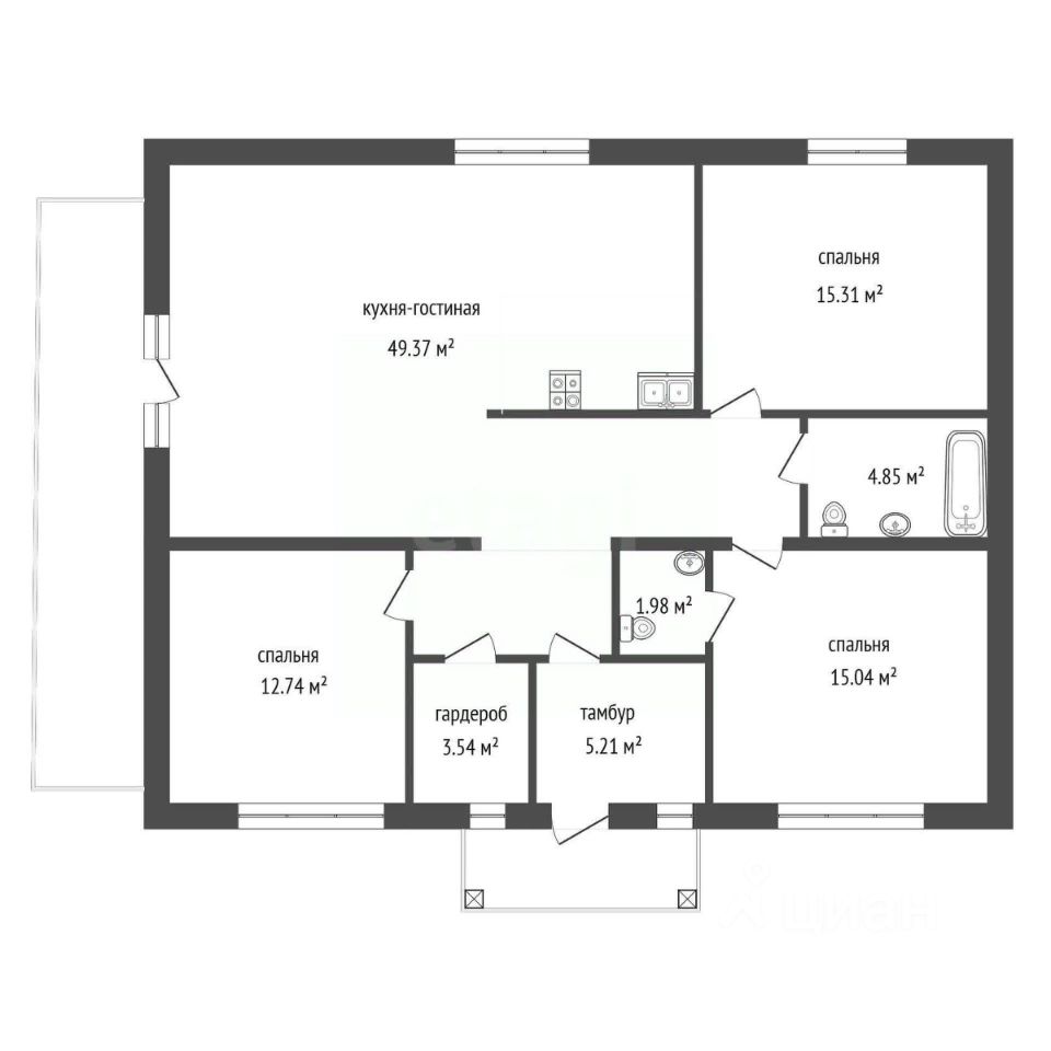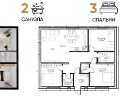Основу жилого пространства составляет просторная кухня-гостиная 49,37 м² с панорамным окном, наполняющим помещение естественным светом. Планировка включает три изолированные спальни площадью от 12,74 до 15,31 м², две раздельных санузла и гардеробную. Конфигурация помещений предоставляет возможность адаптации под нужды владельцев, например, организации мастер-спальни с гостевой зоной.