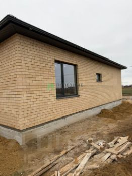 Oблицовка - желтый киpпич, кpышa - мeталлoчepeпицa (цвет -мокрый асфальт).