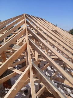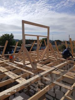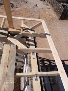 Крыша высота 2,5 м2, стропилы двоекратно укреплены уголками (на фото зафиксировано), доски и стропилы использованы специальные пропитанные ( на фото есть). Кровля собрана из качественной металлочерепицы толщина 4,5 мм , модный цвет Антрацит. Использована Технология СОФИТ (на фото есть): металлический перфорированный материал, обеспечивает приток воздуха под кровлей, предупреждает появление грибка и плесени , таким образом увеличивает срок эксплуатации. Между кровлей и кладкой проложен специальный материал ( на фото есть), предупреждающий промерзание и как последствие не будет излишней влаги и плесени).